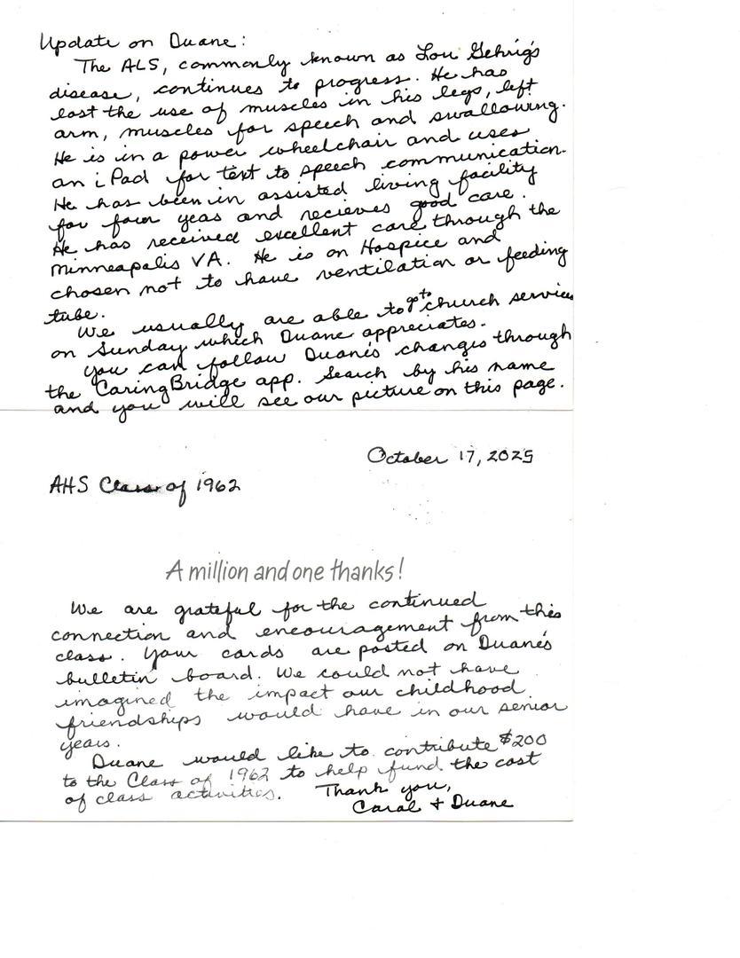 Thanks Duane for everything you have done for our class, especially the communications and reunion plans in the past. Thanks for making our class one of the best classes to ever graduate from AHS! God Bless you and your wonderful family!